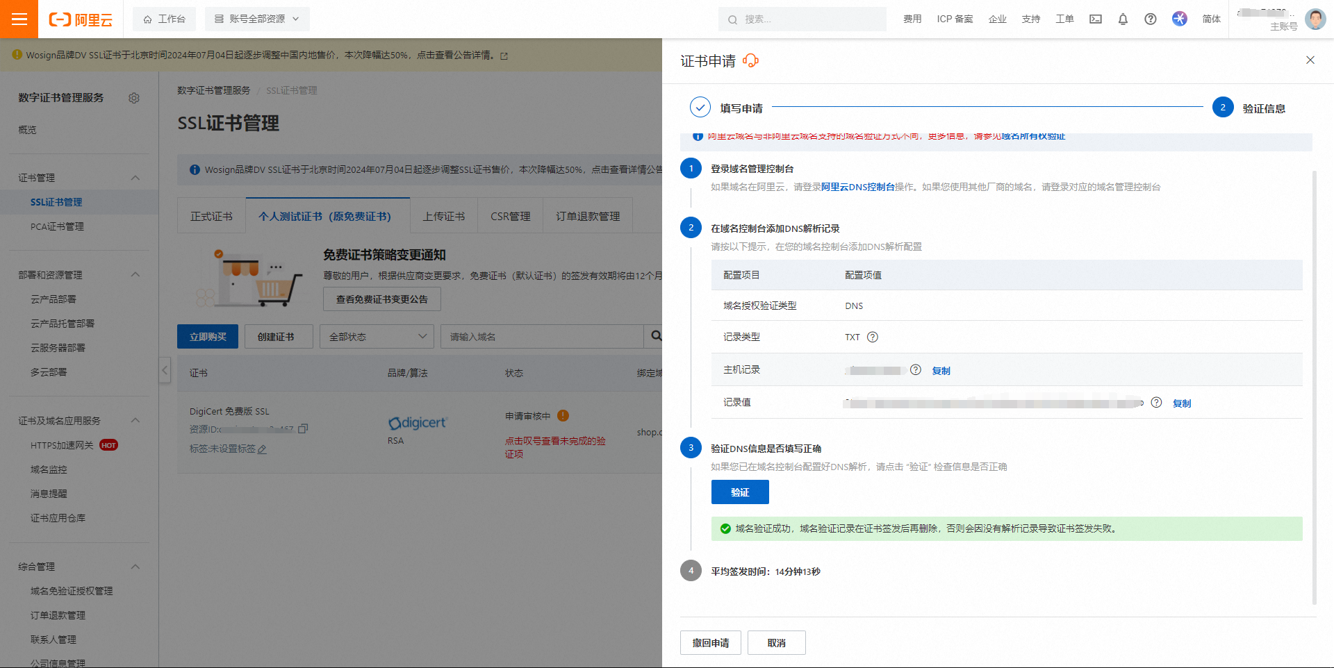 4.下一步-验证-提交审核。(如果你申请证书的域名不在该账号,你需要在域名的管理里,添加一条特定的 DNS 记录,按照以下信息添加)