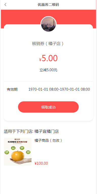 扫码二维码跳转到优惠券二维码页面,显示平台logo,优惠券名称,优惠券优惠金额,优惠券使用有效期,领取按钮,优惠券使用范围,指定商品