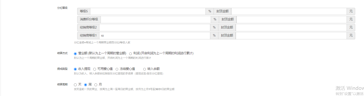 3、封顶功能:开启后根据经销商参与股东分红等级可以给不同等级经销商等级设置封顶金额,如果不设置则表示没有封顶金额