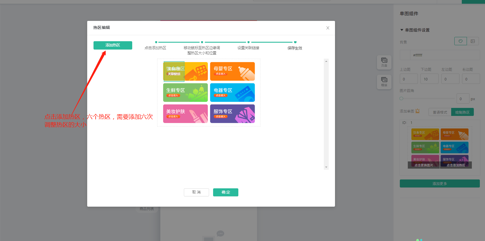 ⑧、第三种方法,可以拖动单图,上传设计好的单图,如果这张单图有多个专区,可以绘制热区,选择对应的商品 分类