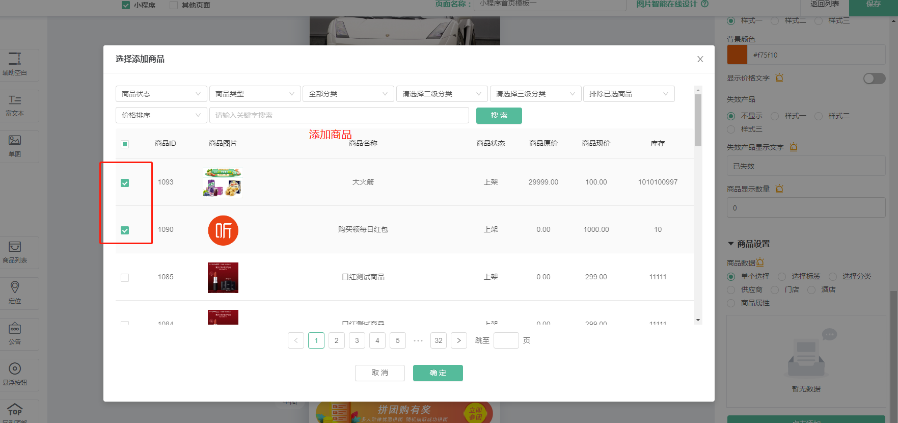 ③在最右侧往下拉,可以单个选择商品或者选择分类,首先单个选择:拉至商品设置--添加商品