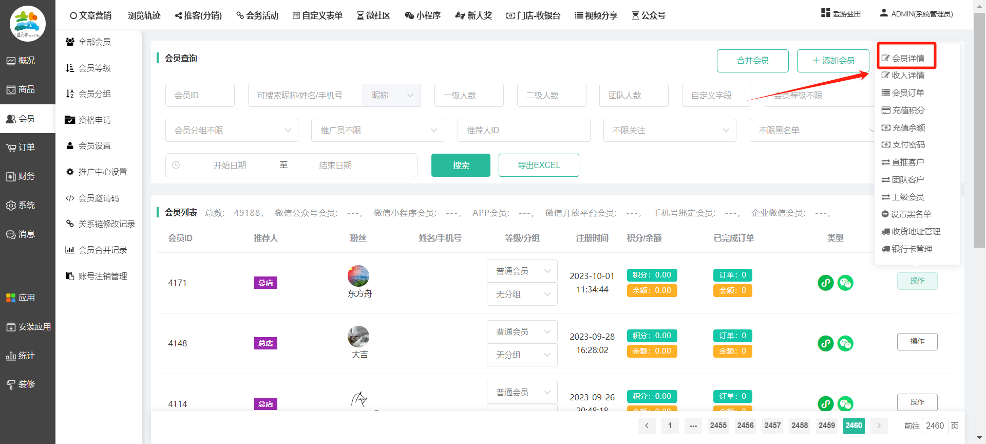 目录 搜索 展开 一、前期准备资料二、数字乡村码-上线操作指南1、服务号的申请流程及认证2、申请小程序流程3、开放平台绑定小程序和公众号三、数字乡村码-系统操作数字乡村码系统管理-概况数字乡村码-商品管理1、发布商品2、商品列表3、商品表单4、商品分类5、品牌管理6、配送模板7、评论管理8、优惠券管理9、商品标签10、退货地址设置11、满额优惠12、批量操作13、配送方式14、基础设置15、商品隐藏四、数字乡村码-会员管理1、全部会员2、会员等级3、会员分组4、资格申请5、会员设置6、推广中心设置7、会员邀请码8、会员关系链修改关系链修改记录9、会员合并记录10、账号注销管理11、会员设置中心五、数字乡村码-订单管理1、订单管理列表2、订单处理流程3、订单状态4、订单修改价格5、订单退款退货6、多包裹发货7、批量发货订单操作步骤8、催发货订单9、物流查询六、数字乡村码-财务管理1、余额设置2、会员余额3、充值记录4、转让记录5、余额明细6、收入明细7、提现设置8、提现统计9、积分管理10、转账审核11、收益广告12、批量充值七、数字乡村码-系统管理1、商城入口2、商城设置①、商城设置②、订单设置③、物流查询④、短信⑤、联系方式⑥、分类⑦、优惠券⑧、分享⑨、幻灯片⑩、广告位⑫、地图设置3、交易设置4、微信模板消息自定义消息模板(新版)自定义消息模板(旧版)小程序消息模板公众号模板消息变更公告5、语言设置6、权限管理7、多媒体管理八、数字乡村码-消息管理九、数字乡村码-应用管理十、数字乡村码系统-数据统计十一、数字乡村码-页面装修DIY1、模板管理2、店铺页面3、顶部导航4、底部导航5、DIY模板市场6、首屏广告7、基础设置8、装修DIY尺寸建议十二、供应商功能插件操作指南1、供应商2、门店-收银台门店申请和使用步骤门店管理①、门店-收银台 营销设置②、门店-收银台 分润设置门店分类门店申请门店审核门店商品门店商品订单收银台订单数据统计核销员基础设置默认设置门店装修3、微社区4、会务活动十三、营销插件操作指南活动报名提货卡新人奖微店问卷调查积分视频分享1、视频分享基础设置2、视频分享发现管理3、视频分享分类管理4、视频分享评论管理5、视频分享分红记录6、视频分享短视频中心每日红包幸运大抽奖签到优惠券二维码任务奖励优惠劵文章音频文章付费文章限时购新海报拓客卡操作流程积分活动素材中心视频红包十四、入驻门店应用类1、门店预约2、附近商品3、门店定位设置4、门店控制5、门店满额包邮6、门店满额减7、导入商品8、门店搜索9、门店股东10、核销券11、多门店核销1、商城后台设置2、前端功能演示十五、常见问题1、后台登录密码修改流程2、会员-余额,积分,后台如何进行充值与扣除3、如何修改上下级关系4、一种万能的获取商城小程序路径的方法 暂无相关搜索结果! 阅读次数:1596 本文档使用 模王系统 发布 8、会员关系链修改 8、会员关系链修改一.如何修改上下级关系?1.会员-全部会员-可以通过搜索用户的独立ID,或者用户微信昵称,找到此会员,然后点击右边的(操作)2.再点击会员详情。3.滑到下面,有个推广信息-会员上线,点击修改4.输入上级的ID号,点击搜索,出来此上级会员后点击选择。5.滑到最下面,一定要点击提交按钮。文档更新时间: 2023-11-30 14:56 作者:链上旅行