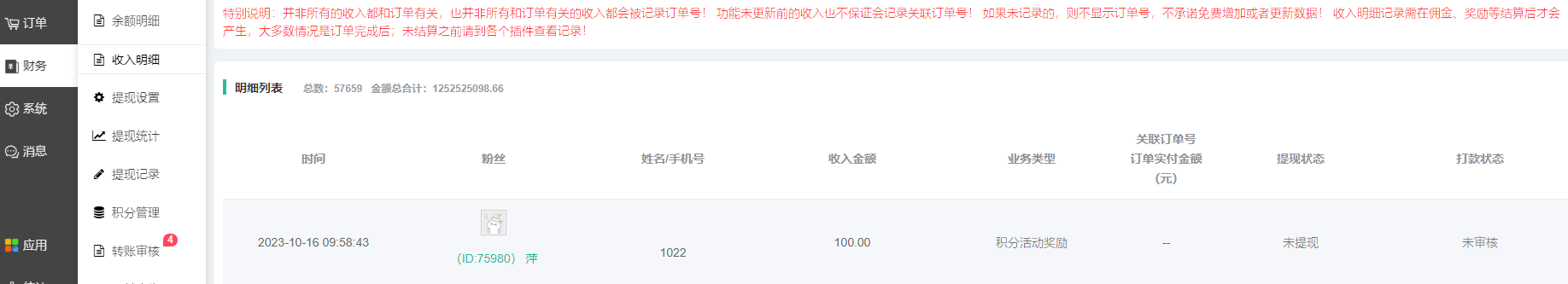 【2】会员购买参与积分活动奖励的商品,下单抵扣使用,订单完成收货后会产生积分活动奖励,奖励给创建活动会员的收入里(在后台--财务--收入明细查看)。 奖励比例根据财务管理--积分基础设置--1积分抵扣n元来计算奖励。举例,1积分可抵扣0.5元,会员领取2积分,下单全额抵扣1元,订单完成收货后系统便奖励创建活动会员1积分活动奖励收入。