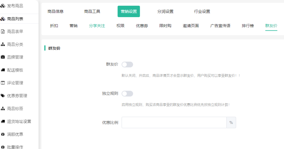 1、社群营销开关按钮:控制前端商品是否能使用群友价
