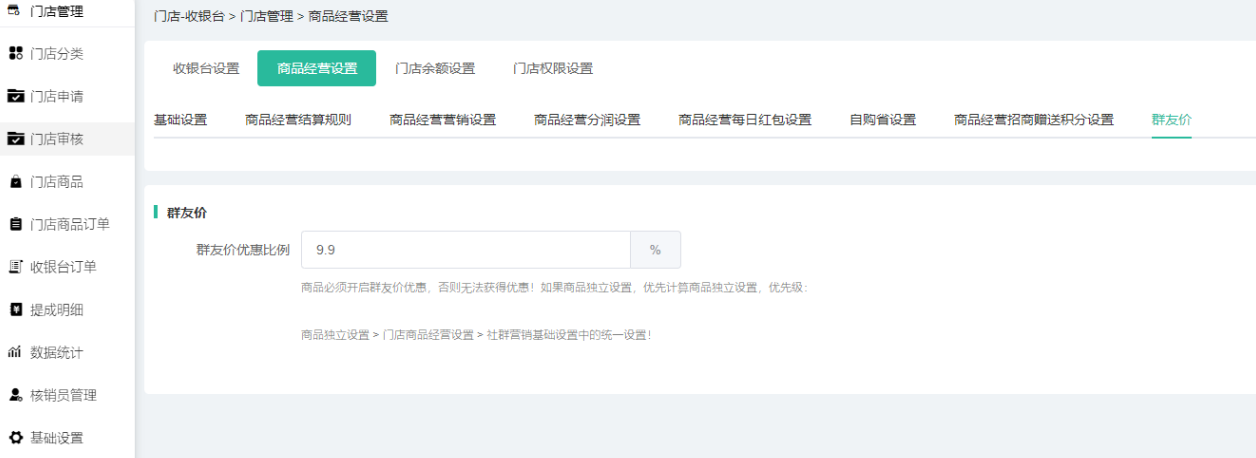 群友价优惠比例:只有门店商品群友价是单门店独立判断才是使用该设置的比例