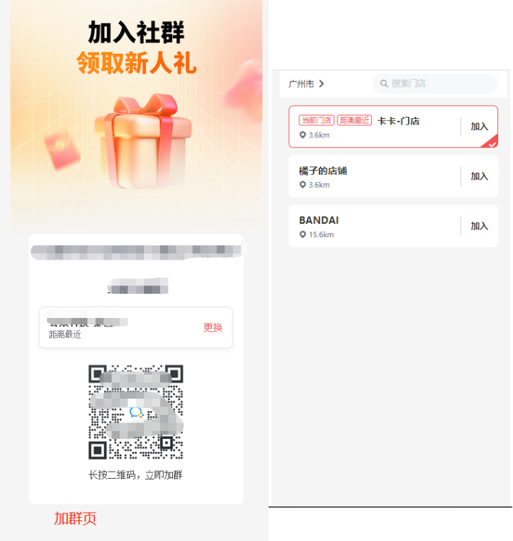 1、基础设置开启门店后,只有开启了参与状态和有关联群的门店才会在前端加群页显示